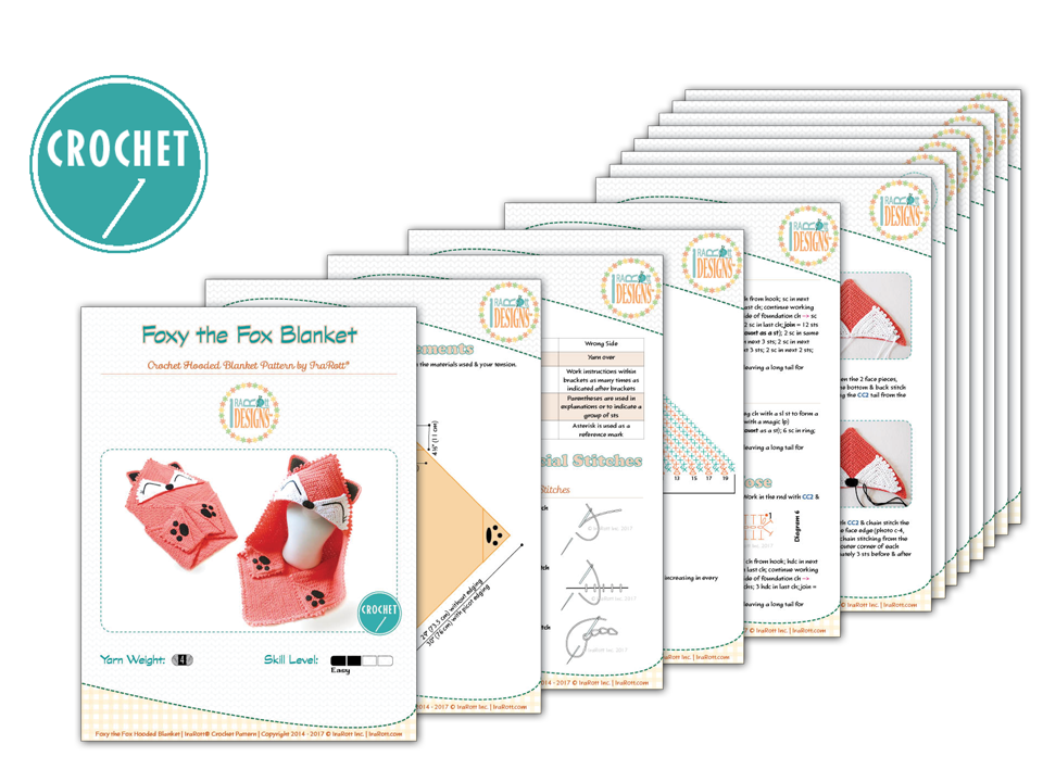 Take this sweet Foxy the Fox Hooded Blanket to the beach, snuggle with your tyke, or take it camping 'round the campfire. This pattern is written row-by-row using US crochet terms with step-by-step photos, crochet diagrams, and a conversion chart to UK terms.