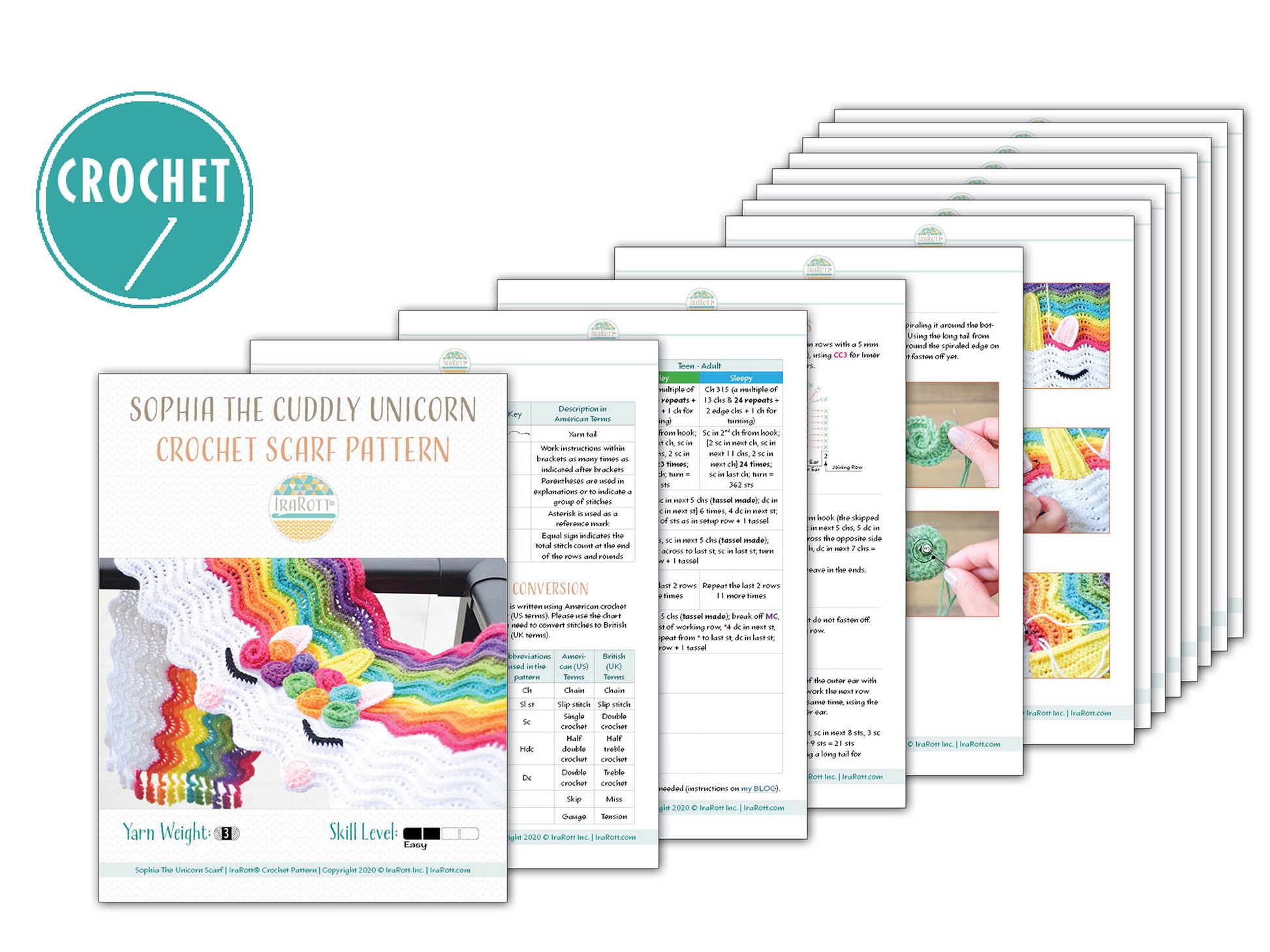 Make your dreams come true with this magical enchanting Unicorn that appears to only a rare few. Sophia the Cuddly Unicorn will envelop you with magic to keep you snuggled and warm. The scarf can be finished with sleepy or smiley eyes (both instructions are included). This pattern is written row-by-row using US crochet terms, along with crochet diagrams, step-by-step photos, and a conversion chart to UK terms.