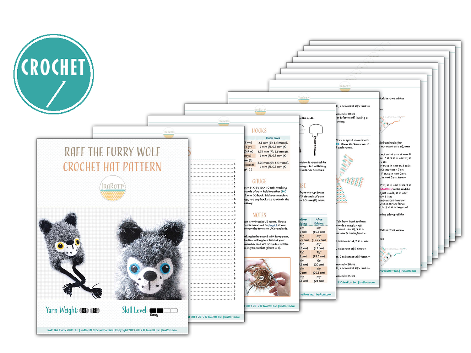 Your kiddos will go wild with delight for this Raff The Wolf Hat — a super-cozy, fur-filled howler! This pattern comes in 7 sizes to cozy up with your entire family on a special woodland adventure. It can be used as a fun addition to a Halloween costume or be worn on a cold winter day. The pattern is written row-by-row using US crochet terms with step-by-step photos, crochet diagrams, and a conversion chart to UK terms.