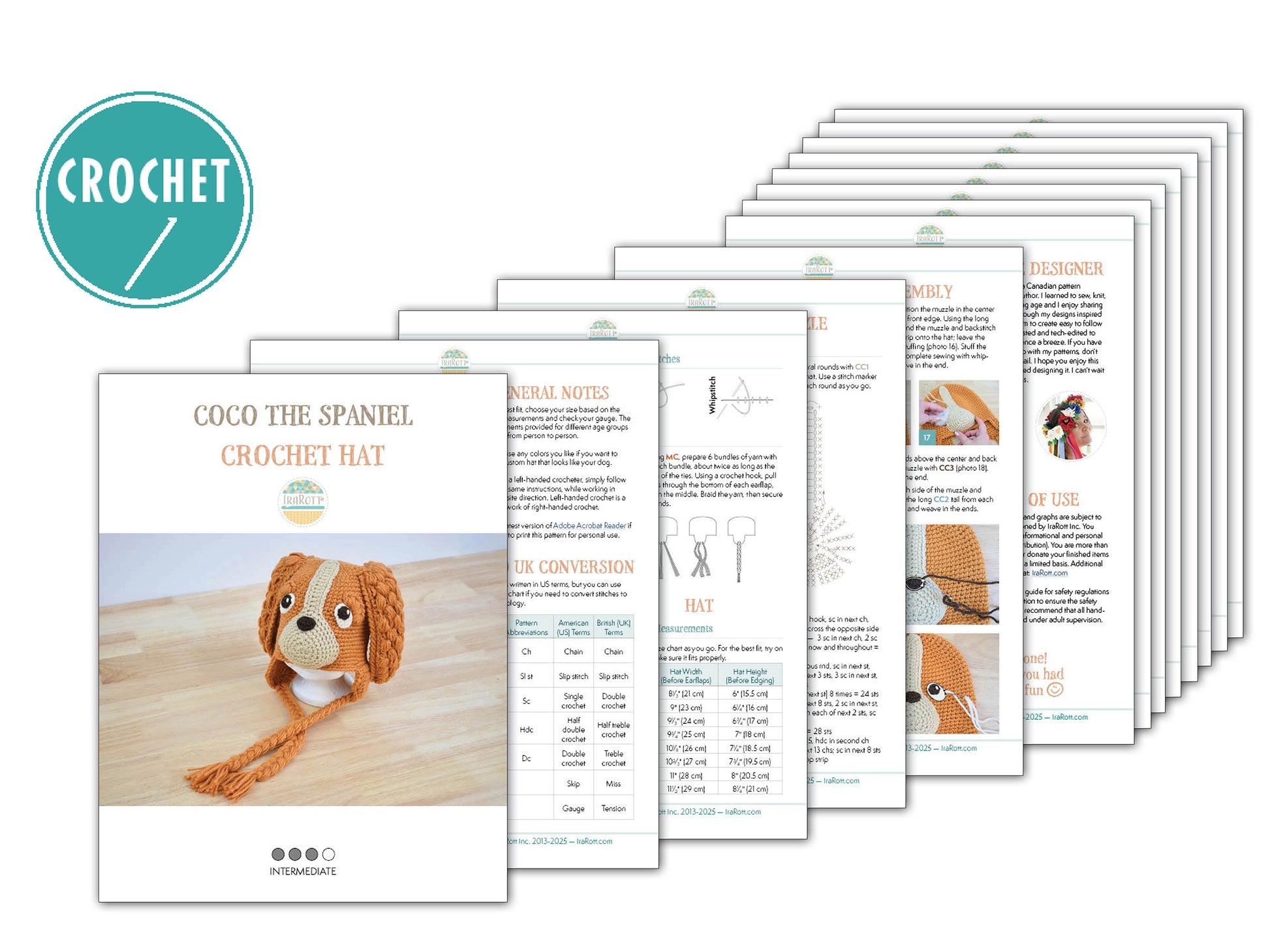 CoCo the Spaniel hat will keep your kiddos warm and cozy while twinning with their furry pal! This pattern comes in 8 sizes ranging from babies to large adults. It is written row-by-row using US crochet terms, including crochet diagrams, step-by-step photos, and a conversion chart to UK terms.