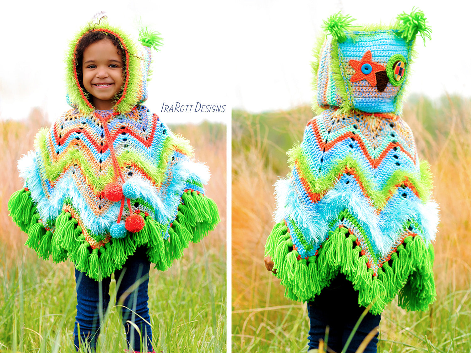 Fiesta Owl Poncho with Hood will keep you warm and toasty, perfect for crisp days when you're ready for a stroll. Sizes span from kiddos to grown-ups, so you and your mini-me can rock twinning ponchos! This pattern is written row-by-row using American crochet terms. It also includes crochet diagram, special stitches, and helpful step-by-step photos.