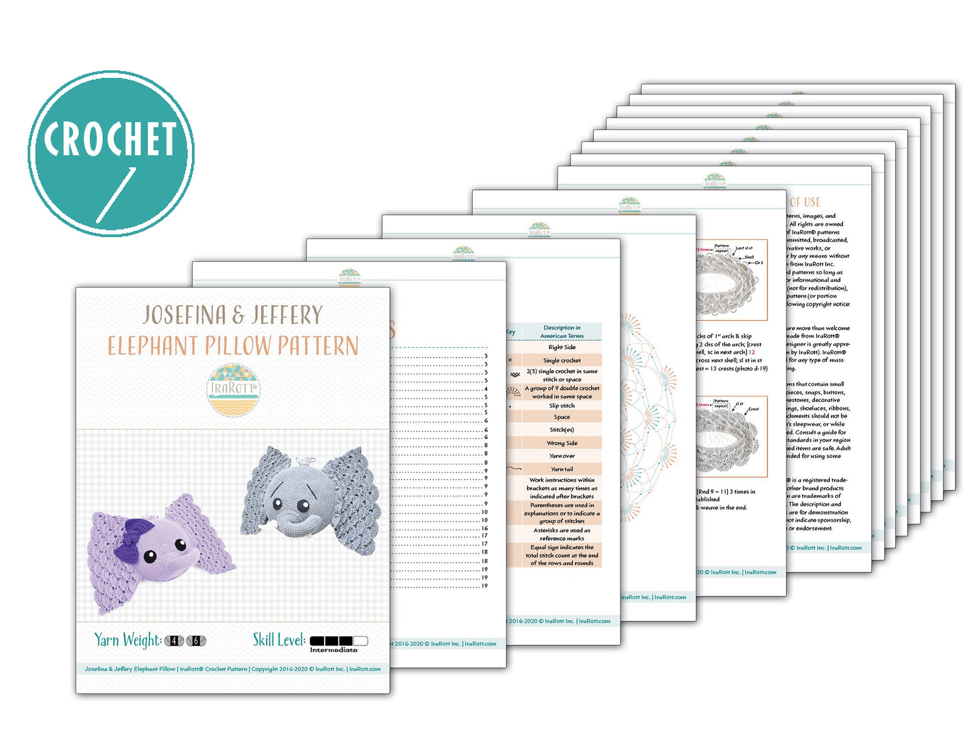 If nap time is your happy hour, you will enjoy snuggling with this cute elephant. You can use any colors you like to make your very own Josefina or Jeffery pillow. This pattern is written row-by-row using US crochet terms and it includes crochet diagrams, step-by-step photos, and a conversion chart to UK terms.