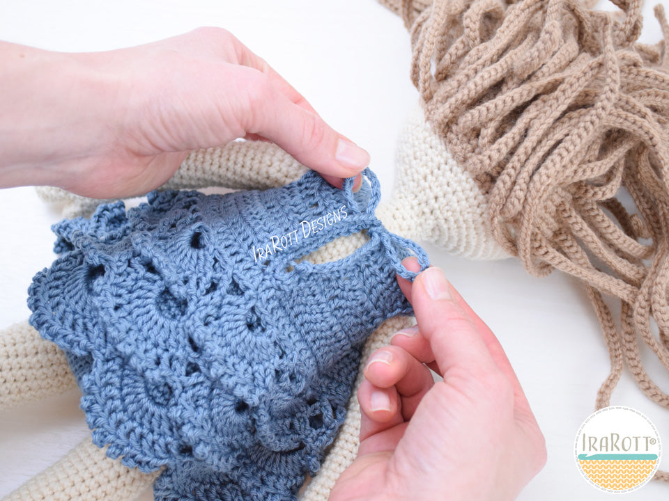 • For Doll: Any DK / Light weight yarn (3); Qty: 160-170 yds (146-155 m) of natural color for body & the same amount of dark taupe color for hair; 180-190 yds (164-173 m) of denim color for outfit; a small amount of pink color for mouth