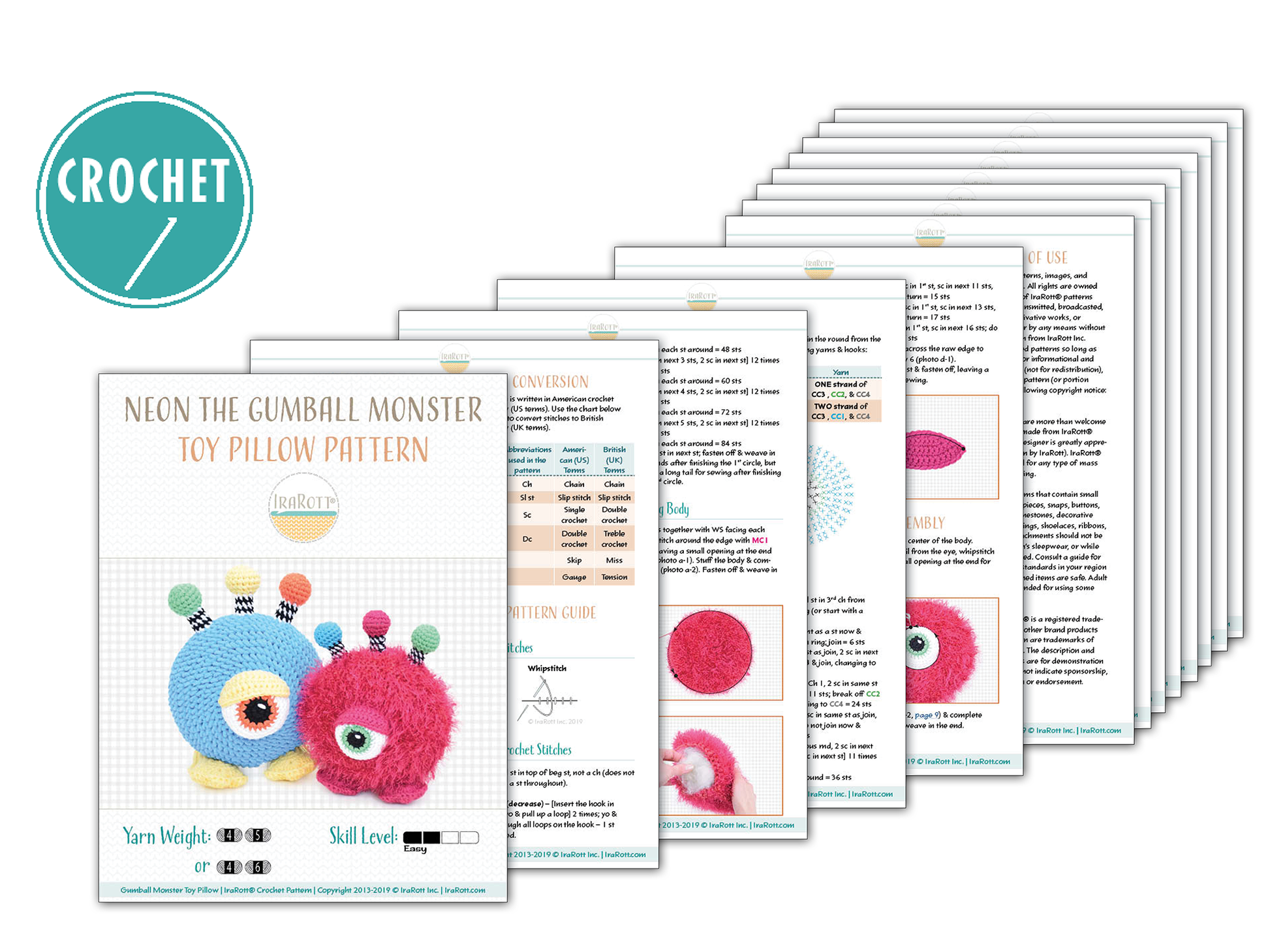 Neon the Gumball is a sweet little monster who loves to play and interact. Bedtime is always more fun with a cuddly monster that turns into a pillow and makes your dreams come true. This pattern is written row-by-row using US crochet terms, including crochet diagrams, step-by-step photos, and a conversion chart to UK terms.