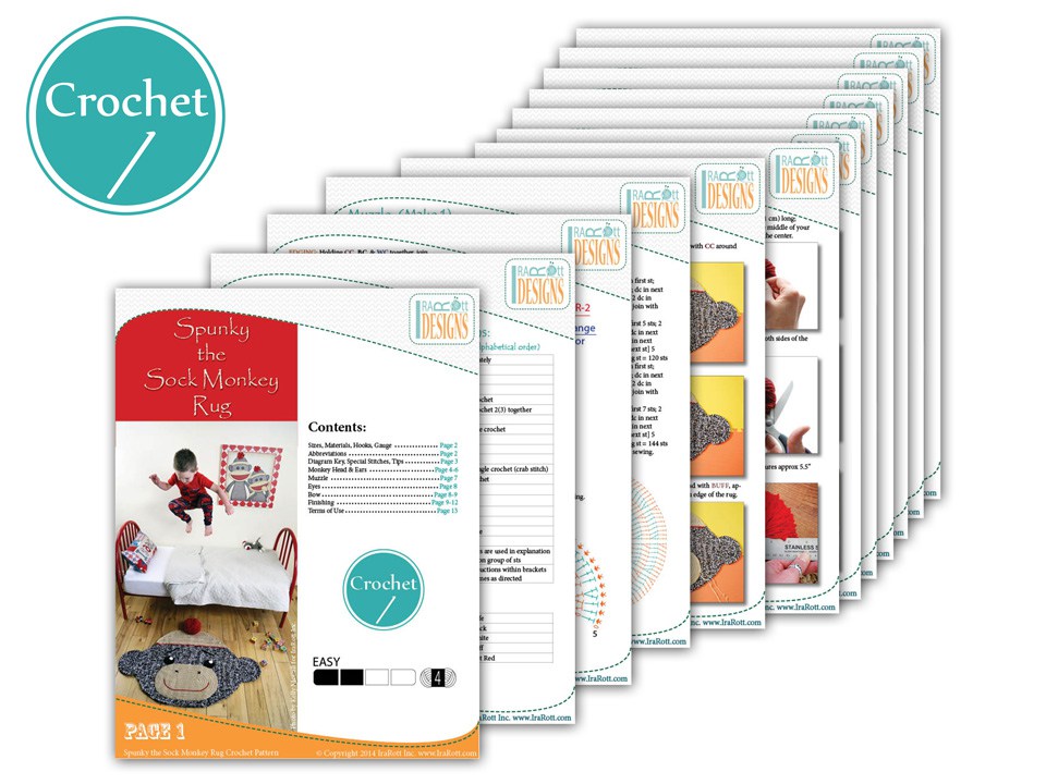 Create a cozy critter corner for your kiddos to play and read on with this Spunky the Sock Monkey Area Rug! This pattern is written row-by-row using US crochet terms, along with crochet diagrams, step-by-step photos and a conversion chart to UK terms.