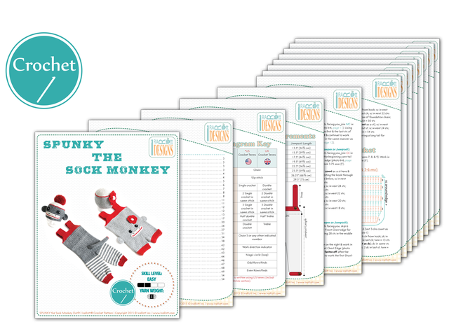 Make this cutest Spunky the Sock Monkey hat and a romper-jumpsuit for your mini mischief-maker to jump and zoom around! This pattern is written row-by-row using US crochet terms, along with crochet diagrams, step-by-step photos, and a conversion chart to UK terms.