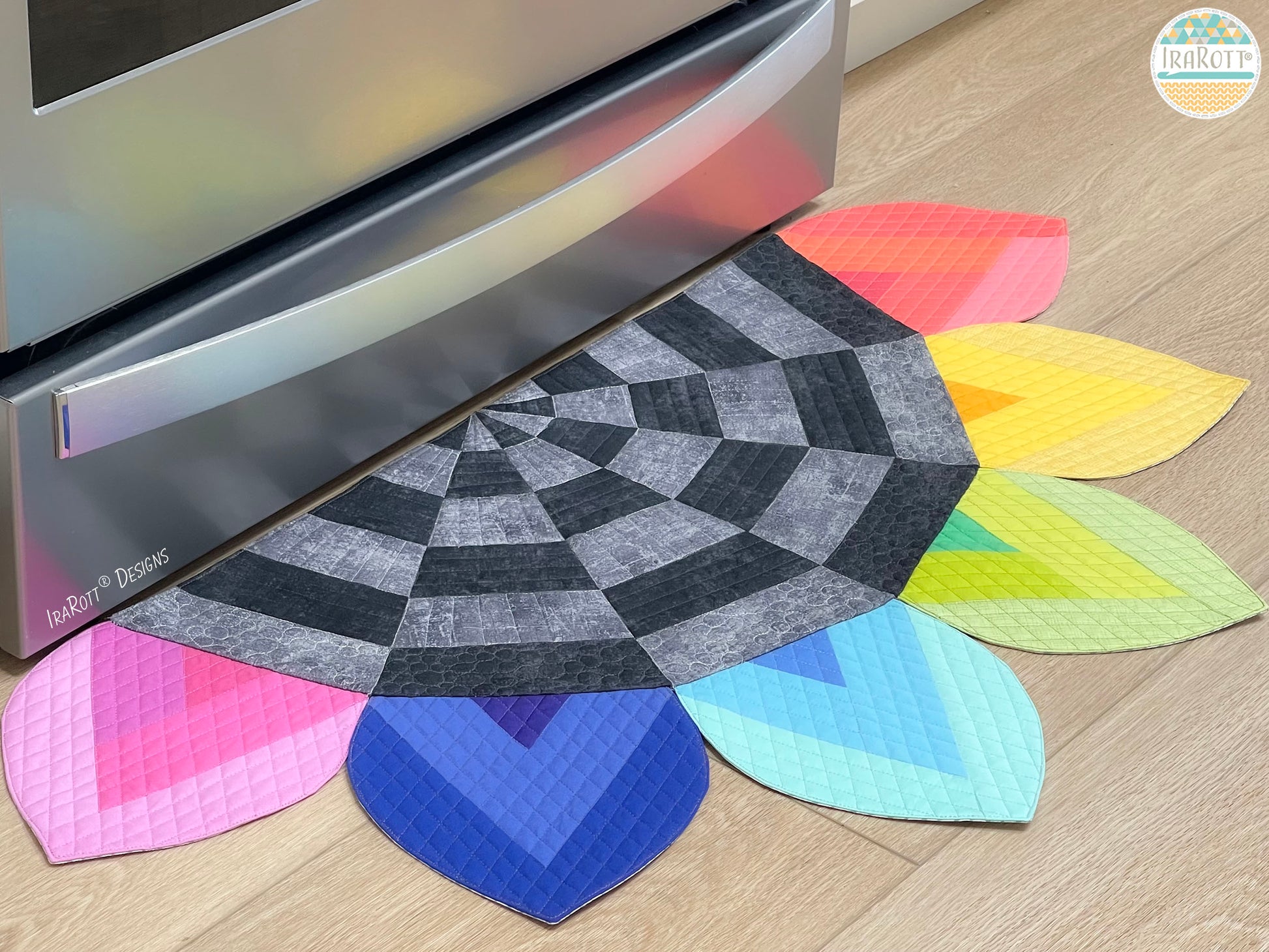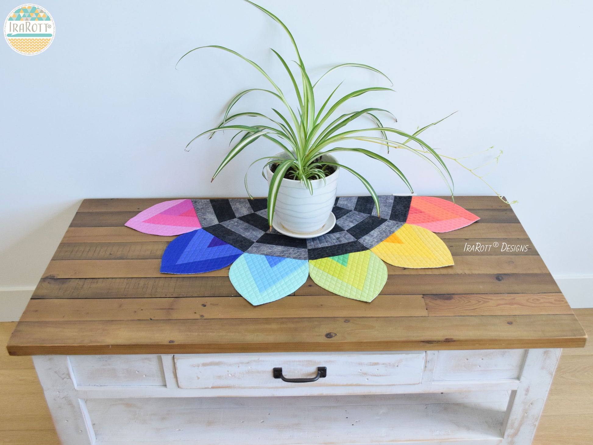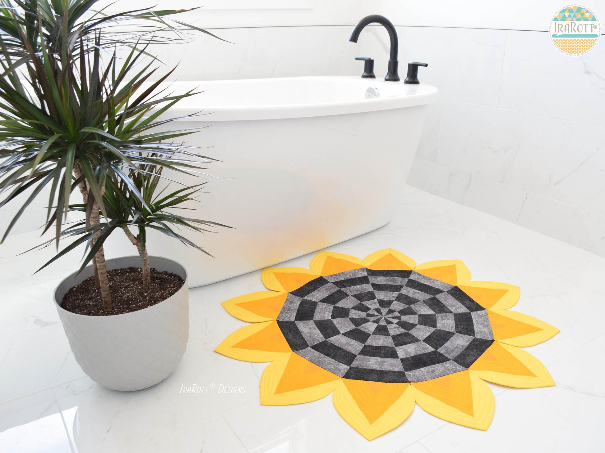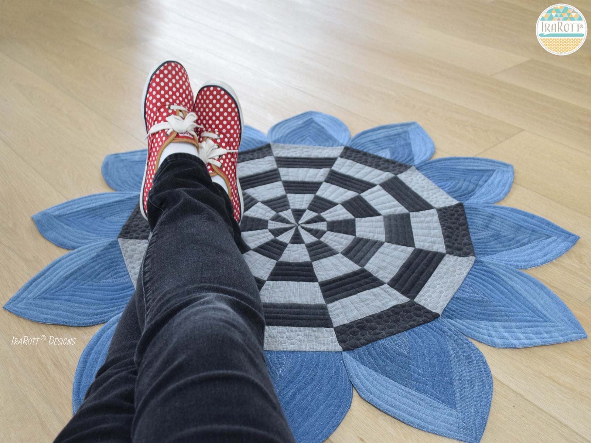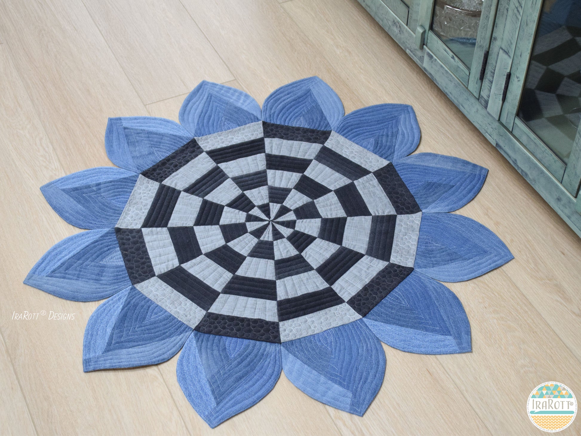 Shine bright like a sunflower and spread seeds of happiness with this colorful art quilt in your home. You can make a round area rug or semi-round table topper/ welcome mat, using Jelly Roll strips from your stash or denim strips from your old jeans. Where there is sunshine, the happiness will never fade away. The pattern is written using imperial system of units (US terms). It includes step-by-step images, printable templates, and quilting diagrams. You will need a printer and Adobe Acrobat Reader to print the templates.